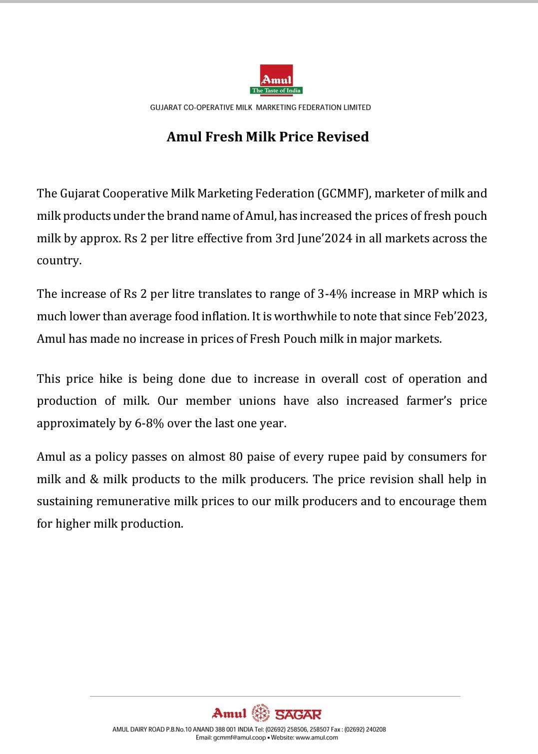 The GCMMF has released an official note mentioning the price rise, while a list with new tariffs has been sent to its distributors. Amid the price hike, Amul said the increased prices are only 3-4 per cent, which is much less than food inflation.